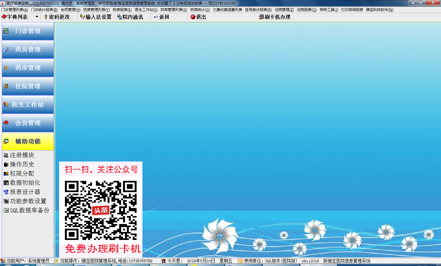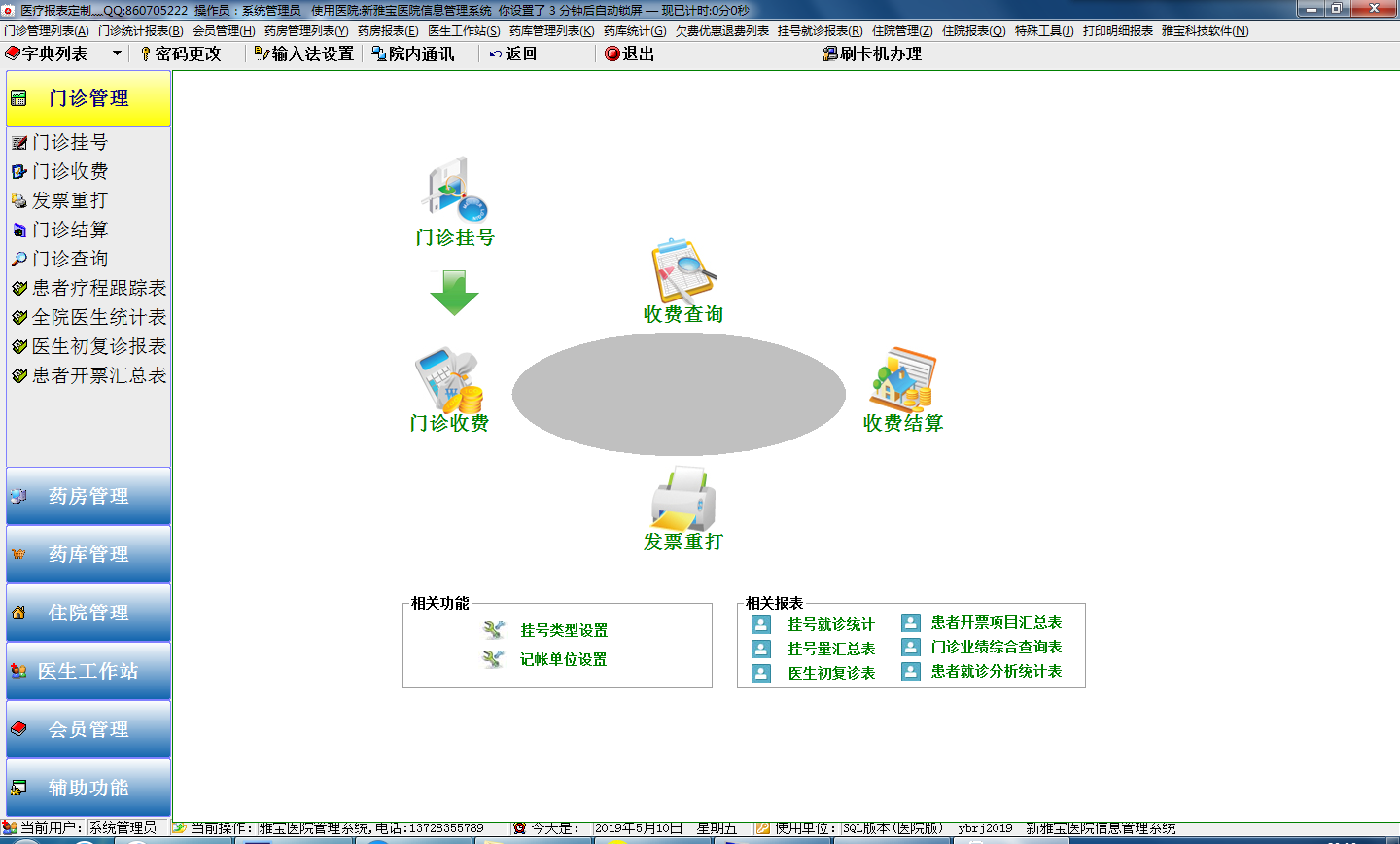 雅宝软件重点功能:1、 数据库备份/恢复功能;2、住院收费结算报表;3、住院发药、领药;4、收费员挂单、提单;5、住院部发药汇总表,6、住院固费记帐停止功能(按组停止,也可按项目停止);7、住院记帐时不打印功能;8、数据库自动升级功能。 9、 医院住院病区图表、10、门诊财务记帐功能、11、微信在线挂号平台、12、两套帐一键切换功能。13、电子处方、瓶签打印、输液卡打印、医生处方打印功能。14、管理员可删除员工密码、 15、收费员结算锁定及统计、16、 住院一日清单有三种格式打印、17、 挂号单号限时使用,挂号号作废限时、挂号时男女性别锁定、18、发票打印出来的金额为两位小数。19、开启收费窗口医保、社保患者提示功能、20、零头可调整为任意项目、21、按科室设置药品零售价(收费时可直接区分内科、专科同药品不同价格)。 22、同一张处方多种相同药品收费时数量可自动累加。23、收费员可调入当日挂号患者名单。24、药品盘点表排序功能、药品查询打印分页功能。25、挂号病种全部调出窗口。26、可定制全国收费发票格式。
